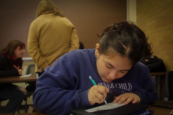 10th April 2025 Locked In Haley Garcia, a sophomore at the University of North Texas, sits in class, completing a class activity in her Korean Language class.